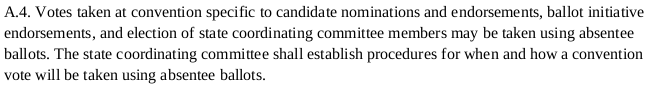There is no requirement to use absentee voting in any case. Convention rules are set by a majority of supporting members present, again by Article VIII. The majority present in January 2023 didn’t decide to use it for the resolutions, though it did for the SCC election.