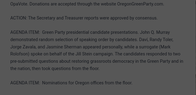 May 5 convention called to order 11:02 a.m. AGENDA ITEM: Dan Pulju shared the Secretary and Treasurer report. Secretary: The OpaVote results were recognized from all persons registered for the February convention and granted ballots, as representing the decision of the Pacific Green Party in convention. Lori Burton, Dan Pulju, and Devon Lawson McCourt were